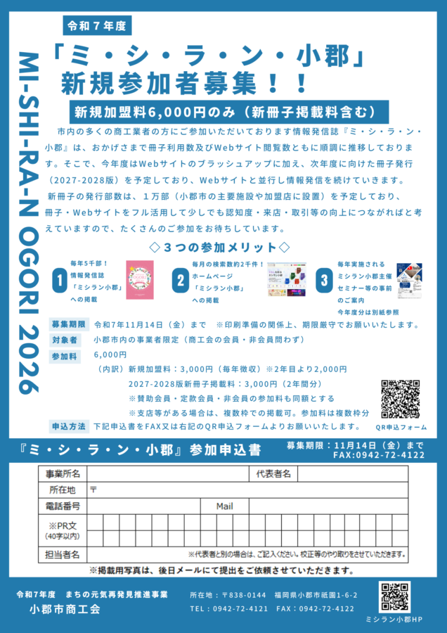 市内の多くの商工業者の方にご参加いただいております情報発信誌『ミ・シ・ラ・ン・小郡』は、おかげさまで冊子利用数及びWebサイト閲覧数ともに順調に推移しております。そこで、今年度はWebサイトのブラッシュアップに加え、次年度に向けた冊子発行(2027-2028版)を予定しており、Webサイトと並行し情報発信を続けていきます。
